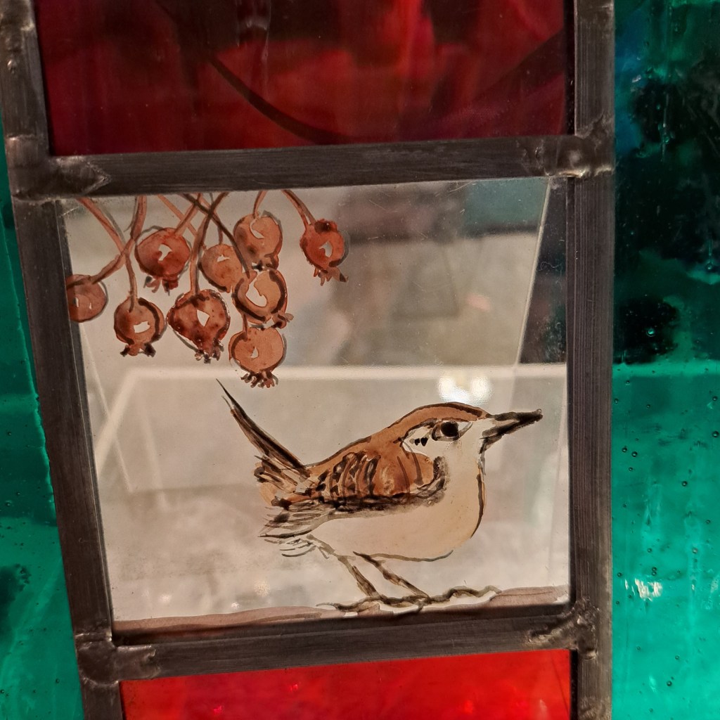 Hand painted and fired panels, framed in vivid red, with small accents of blue and green.